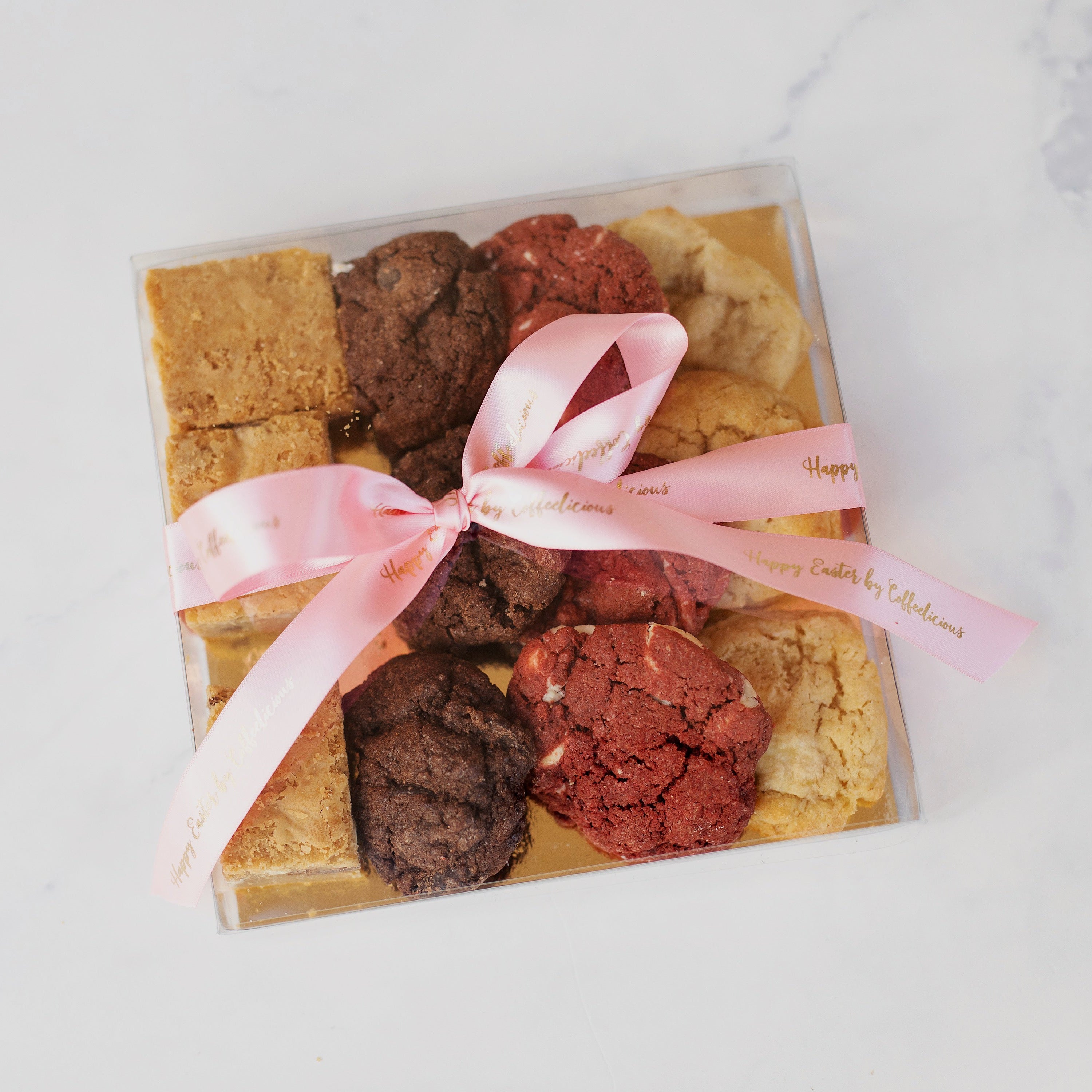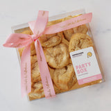 Speciaal voor Pasen hebben we twee varianten van deze box: een box met uitsluitend onze Paas Cookie, Lemon, en een variant zoals je onze Party Box kent, maar dan met een feestelijke Paas twist. In deze box kun je lekkernijen verwachten zoals een blondie, double chocolate cookie, red velvet cookie en natuurlijk de lemon cookie.